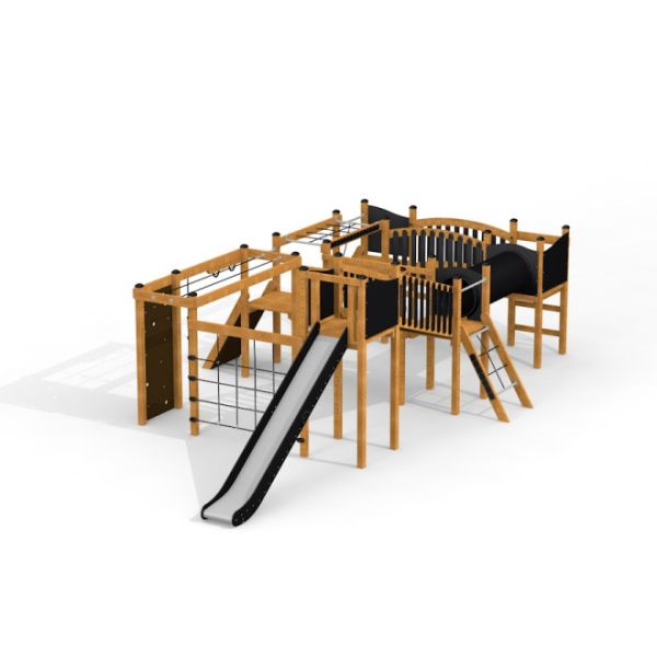 Unsere Holzkonstruktion kommt aus der Produktlinie Classic Nature und ist eine echte Rarität. Wie es sich für eine echte Basis gehört, besitzt „Piraten Basis Natur“ viele Seitengänge, Balkons und Quasi-Korridore. Des Weiteren finden die Kleinen hier vielfältige Spielattraktionen: Holzbrücke, Hängebrücke, Kletterwand und Kletternetz, schräge Kletterwand mit Seil, Holzleiter, horizontale und senkrechte Leiter, Schwebebalken, Tunnel und die unerlässliche Rutsche, dank der man schnell aus dem Abenteuerlabyrinth flüchten kann.