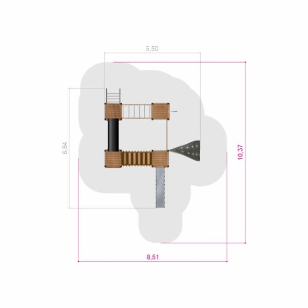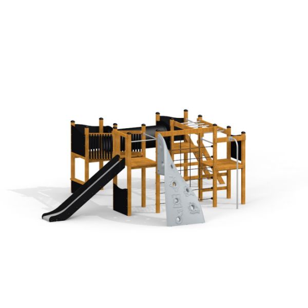 Dieses multifunktionale Holzgerät hat eine ganze Reihe von Einsatzmöglichkeiten, um die physische und psychische Entwicklung der Kleinen zu fördern. Sie finden hier ihre heiß geliebte Rutsche, Tunnel, horizontale Leiter, Holzbrücke, Kletternetz, Kletterwand, Röhrenrutsche, für die sich keine Feuerwehr schämen bräuchte, und dazu noch viele verschiedene Handgriffe und Schlupfwinkel.