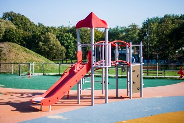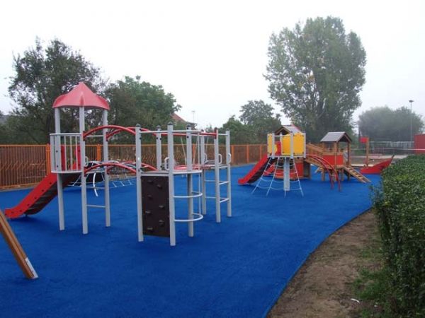 Unsere Spielanlage setzt sich aus einem überdachten Spielturm, verschiedenen Leitern, Brücken und Balkons, einer Kletterwand und Edelstahlrutsche zusammen. Das Spielgerät ist aus Stahl mit rutschfester Struktur, korrosionsfreien und zertifizierten Ketten, Polyethylen-Platten sowie Glasfasern gefertigt.